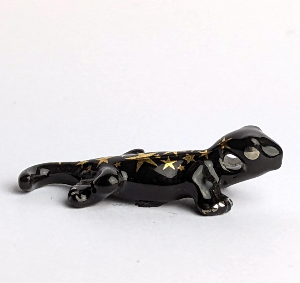 Gekkos sind nicht nur nachtaktive Echsen, die man oft in tropischen Regionen findet, sondern auch sehr faszinierende Tiere. Sie haben die Fähigkeit zu klettern und ihre Hautfarbe an die Umgebung anzupassen. Unsere Figur zeigt einen Gekko in tiefem Schwarz mit goldenen Sternen, die ihm einen besonderen Charme verleihen.