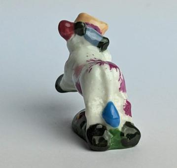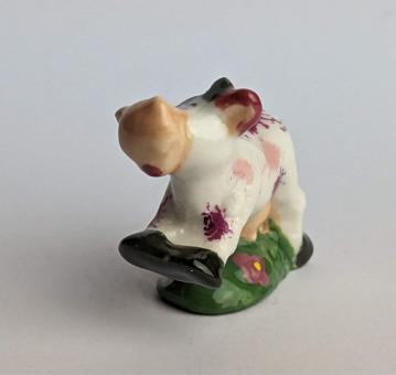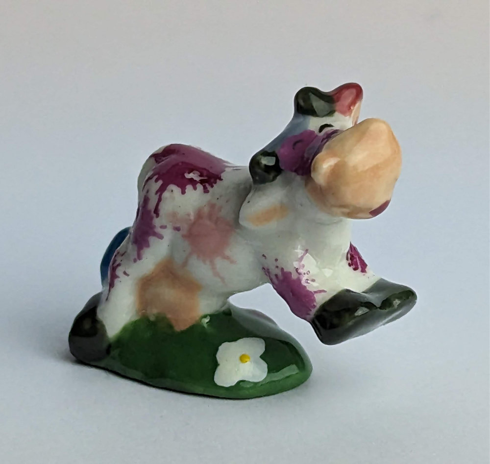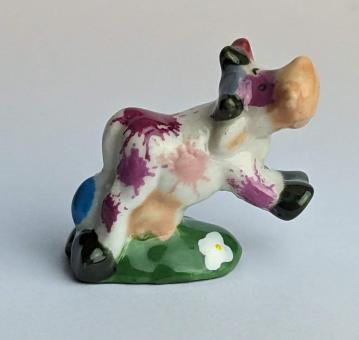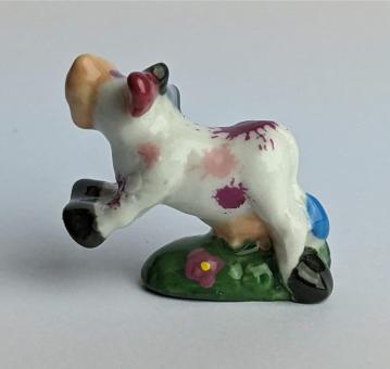 Die künstlerisch liebevoll handbemalte Keramikfigur einer hüpfenden, glücklichen Kuh auf einer Blumenwiese ist ein wunderschönes und einzigartiges Kunstwerk für jeden Kuh-Liebhaber. Mit einer Größe von nur 2 cm passt diese Figur perfekt in jedes Regal oder jede Vitrine und ist somit auch eine tolle Ergänzung für jede Sammlung.